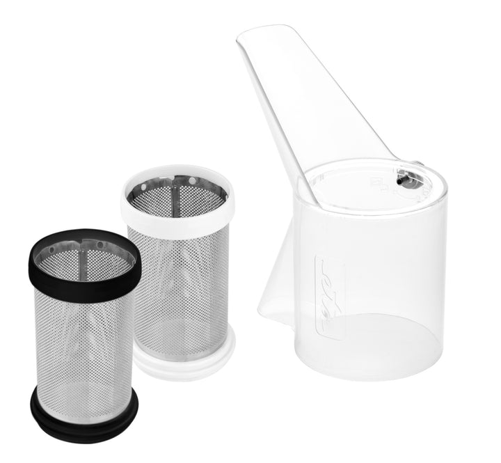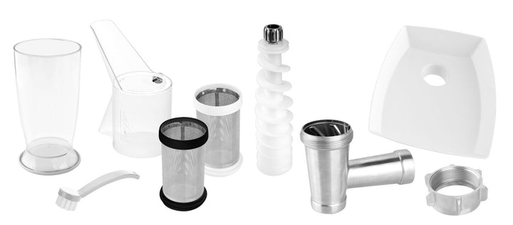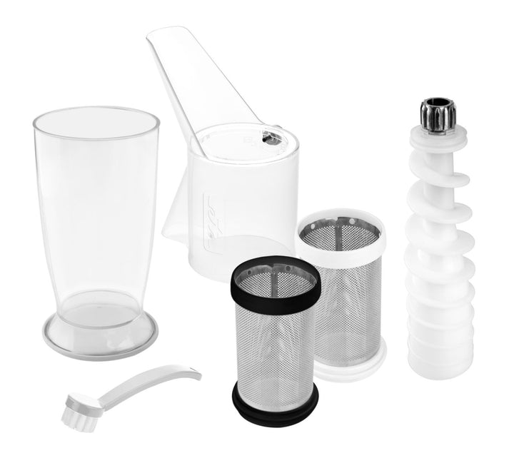 * Dwa kolorowo odróżnione sitka ze stali nierdzewnej (grube z otworami 1 mm / delikatne z otworami 0,6 mm) dla różnego rodzaju obrabianych surowców z możliwością wielokrotnego wyciskania miąższu, który stale jeszcze zawiera sok