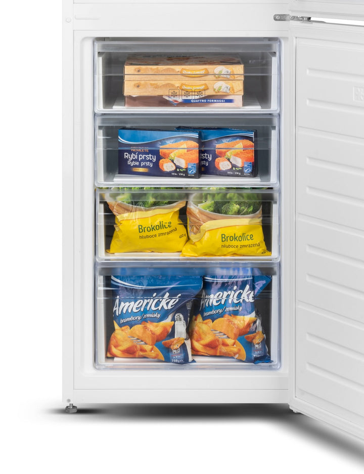 Zamrażarka o pojemności 114 litrów została podzielona na 4 szuflady, dzięki czemu łatwo uporządkujesz wszystkie zapasy. Urządzenie potrafi zamrozić do 5,5 kg żywności na dobę i należy do klasy mrożenia ****. W razie potrzeby możesz skorzystać z funkcji „Super mrożenie”, która zapewnia idealne warunki do szybkiego zamrażania. W przypadku przerwy w dostawie prądu nie musisz się martwić – lodówka utrzyma mrożoną żywność aż do 12,5 godziny.