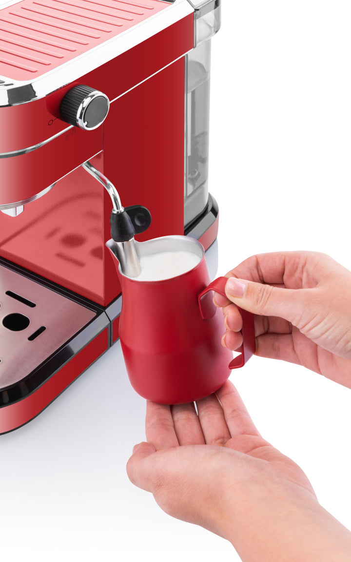 Ten elegancki ekspres przeznaczony jest do kawy mielonej. Dzięki filtrowi z sitkami ze stali nierdzewnej, z podwójnym dnem i pompą o ciśnieniu do 20 barów, w kilka chwil otrzymasz pyszne espresso, takie jak w twojej ulubionej kawiarni. Możesz także zmienić jego ostateczną formę dodając gorącej wody lub nadając mu lekkości dzięki mlecznej piance, którą możesz zrobić za pomocą umieszczonej w bocznej części urządzenia dyszy parowej. Nic nie stoi na przeszkodzie, aby w każdej chwili delektować się cappuccino lub cafe latte.