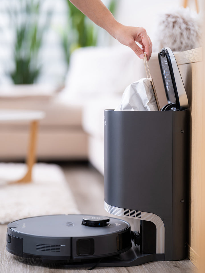 - Stacja dokująca z jednostką odsysającą i workiem - automatyczne opróżnianie pojemnika na brud do worka