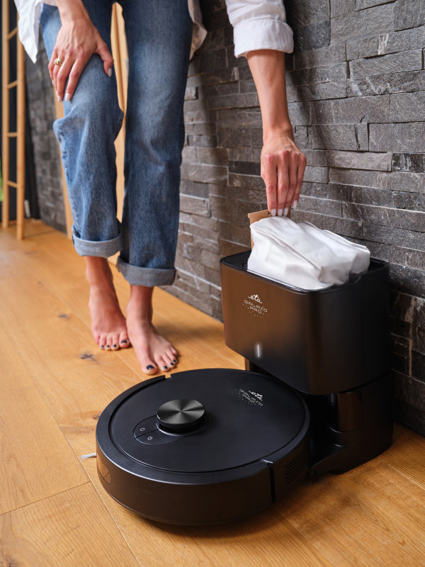 Duża pojemność worka pozwala odkurzaczowi działać przez kilka tygodni bez konieczności jego wymiany. Po napełnieniu wystarczy wyjąć worek i zastąpić go nowym – zapasowe worki ETA623900010 (3 szt. w opakowaniu) można bez problemu dokupić. Stacja odsysająca znacząco zwiększa komfort i efektywność sprzątania, a także stanowi idealne rozwiązanie dla alergików.
