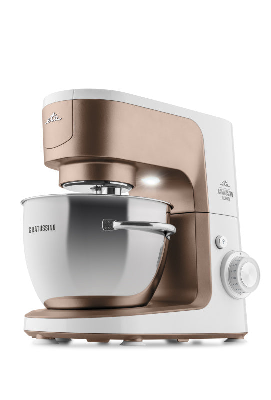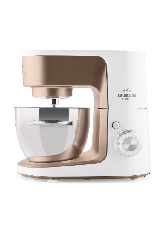 Choć robot planetarny ETA Gratussino III Elements jest nieco mniejszy od swoich większych „braci”, w niczym im nie ustępuje. Mocny silnik 1200 W, cicha praca oraz metalowe zębatki, zapewniają długą żywotność i stałą wydajność. Planetarny system mieszania gwarantuje równomierne mieszanie składników w 4,5-litrowej misie ze stali nierdzewnej, wyposażonej w praktyczne uchwyty i przezroczystą pokrywę.