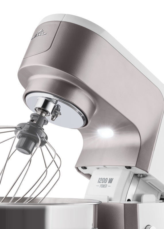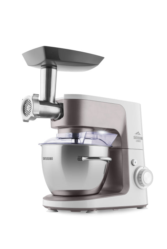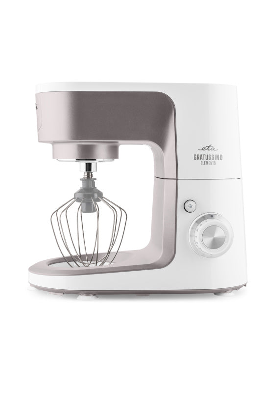 Choć robot planetarny ETA Gratussino III Elements jest nieco mniejszy od swoich większych „braci”, w niczym im nie ustępuje. Mocny silnik 1200 W, cicha praca oraz metalowe zębatki, zapewniają długą żywotność i stałą wydajność. Planetarny system mieszania gwarantuje równomierne mieszanie składników w 4,5-litrowej misie ze stali nierdzewnej, wyposażonej w praktyczne uchwyty i przezroczystą pokrywę.