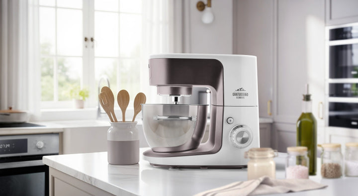 ETA Gratussino III Elements udowadnia, że robot planetarny może być nie tylko niezawodnym pomocnikiem, ale także designerskim dodatkiem. Świetnie sprawdzi się zarówno w mniejszych, jak i większych kuchniach – docenisz jego funkcjonalność, kompaktowe rozmiary i prostą obsługę. Standardem są także: blokada odchylanego ramienia, antypoślizgowe nóżki oraz możliwość mycia elementów niemetalowych w zmywarce.